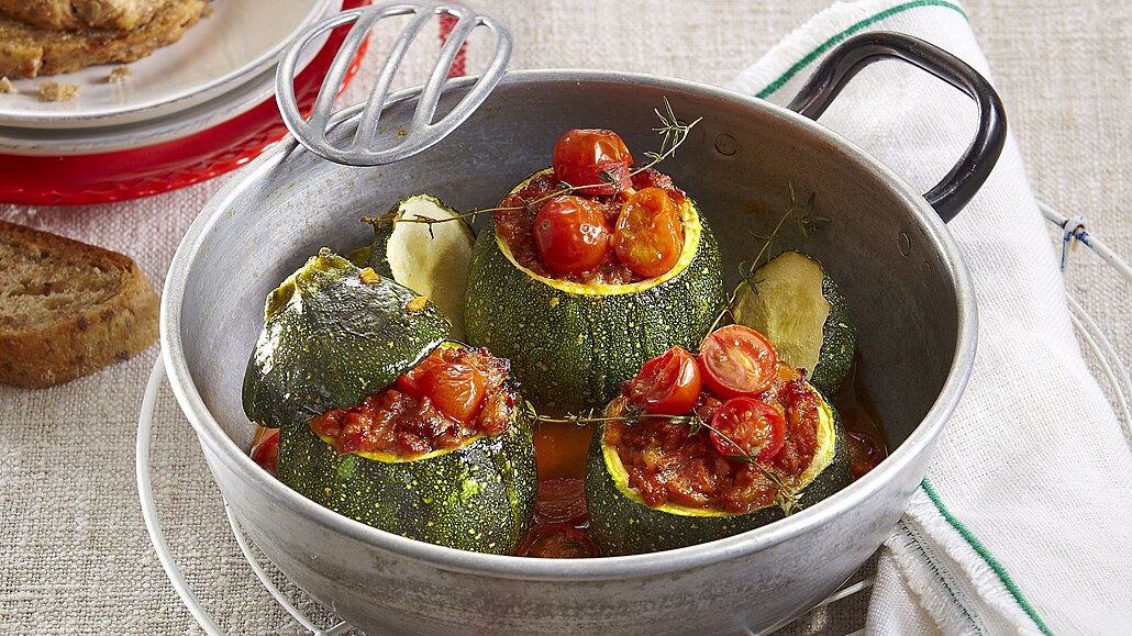 - Cukety posadíme do pekáčku a podlijeme je trochou oleje. V troubě je při 200 °C necháme péct asi 20 minut. Pak na ně navršíme pokrájená rajčátka, přidáme k nim seříznuté vršky a podlijeme je vínem a vývarem. Vrátíme je do trouby a necháme je dopékat asi 15 minut.