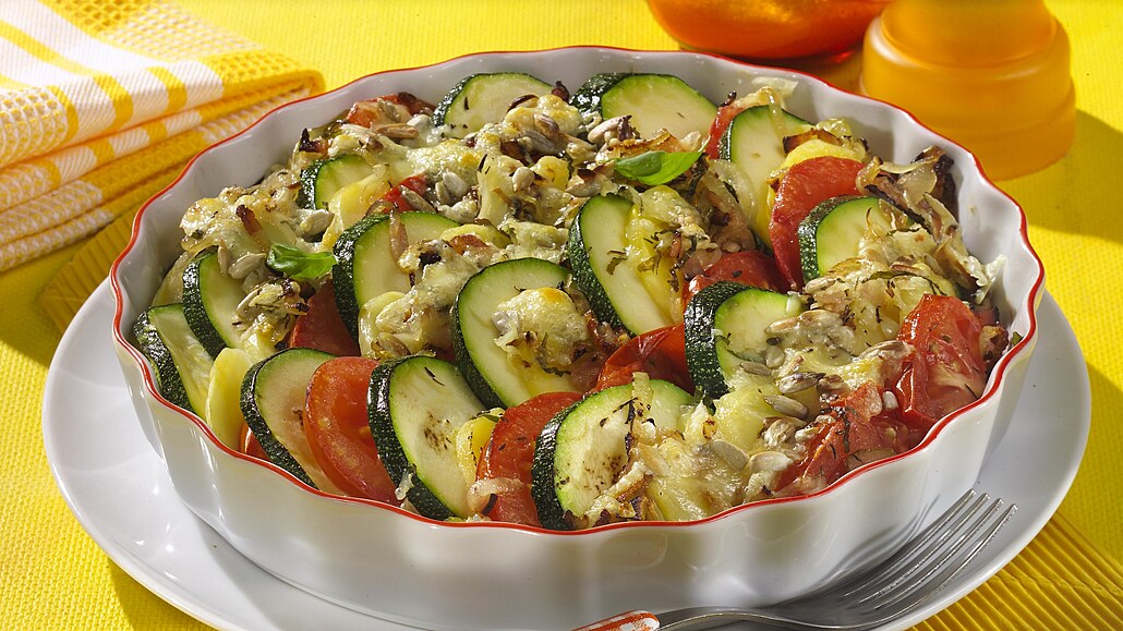 - Tymián, rozmarýn a bazalku opláchneme a nadrobno nasekáme. Sýr nastrouháme nahrubo. Do zapékací nádoby střídavě rozložíme cukety, rajčata a brambory, posypeme osmaženou slaninou s cibulkou a česnekem a okořeníme nasekaným tymiánem, rozmarýnem a bazalkou. Pokud nemáme čerstvé bylinky, můžeme použít i sušené.