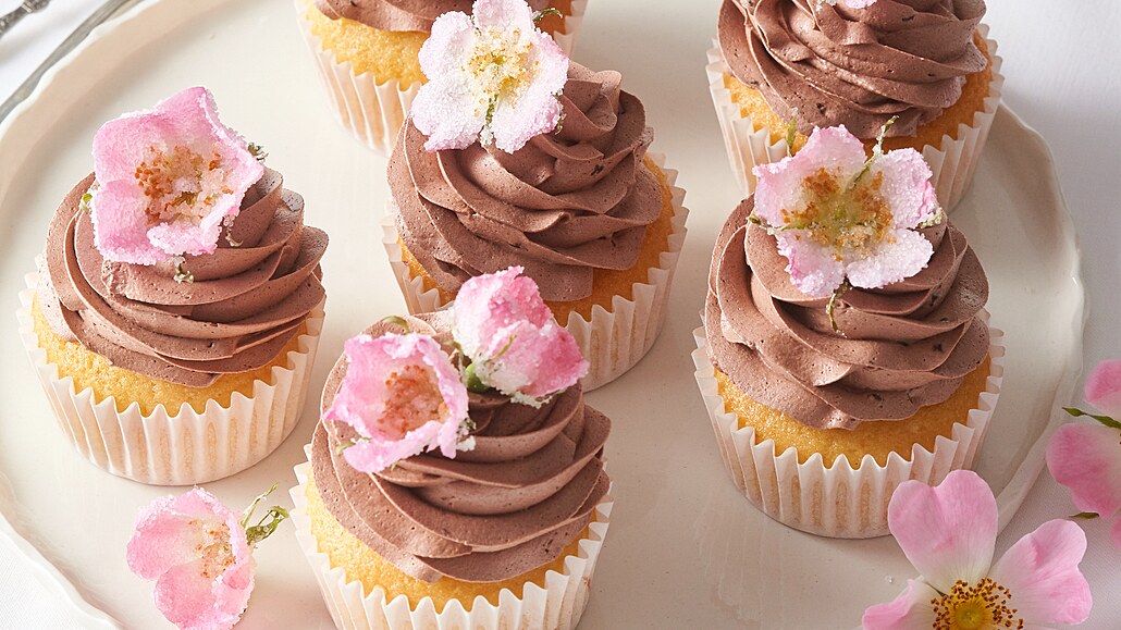 - Na cupcaky pak nastříkáme pomocí cukrářského sáčku vyšlehanou pařížskou šlehačku a ozdobíme připravenými cukrovými květy.