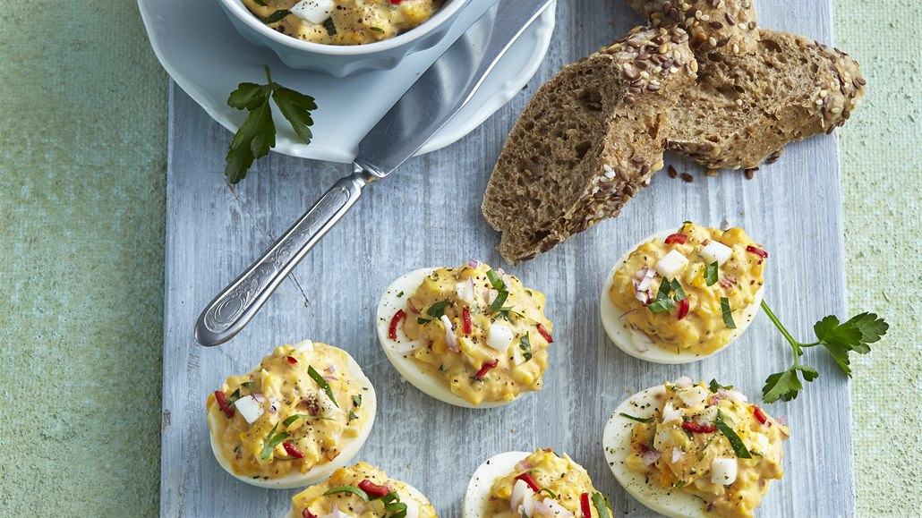 - Cibulku pokrájíme najemno a smícháme ji s hořčicí, majonézou, chilli pastou, sekanou petrželkou, pokrájenou feferonkou a pak dochutíme solí a pepřem. Směsí naplníme půlky vajec a podáváme s celozrnným pečivem.