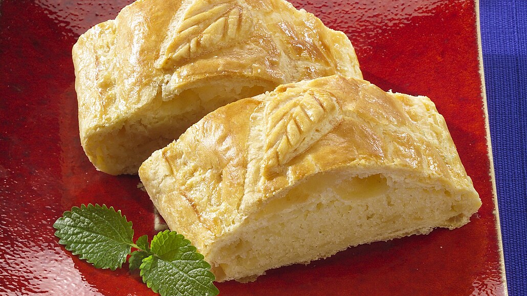 - Listové těsto rozválíme na plát silný asi 3 mm a 18 cm široký. Ten rozřízneme podélně dále na dva pláty o šířce 10 a 8 cm. Širší plát položíme na plech a potřeme vajíčkem