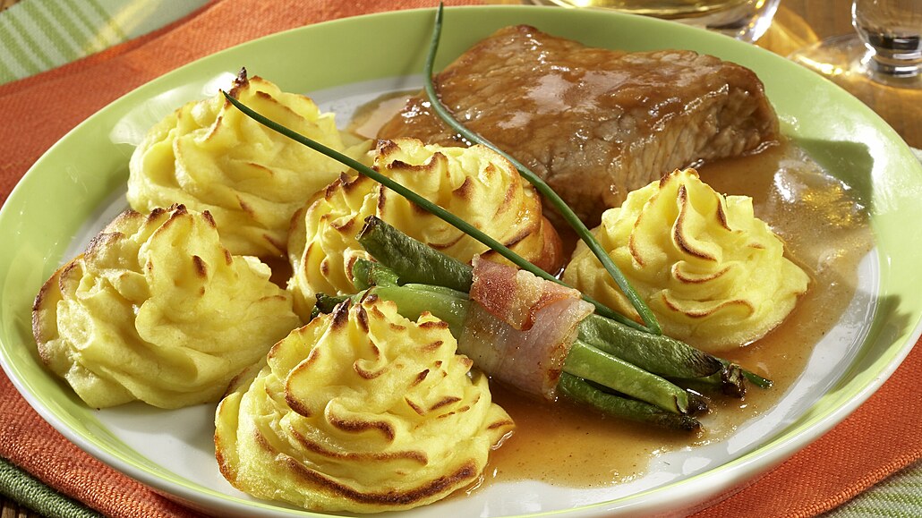 - Bramborovou hmotou naplníme cukrářský sáček s řezanou trubičkou a na vymazaný plech stříkáme malé pusinky. Pečeme v troubě vyhřáté na 190 °C 8-10 minut. Bramborové pusinky chutnají k pečenému vepřovému masu se šťávou.