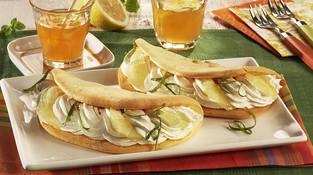 - Do tvarohu vmícháme sladidlo. Smetanu vyšleháme dotuha a přidáme ji k tvarohu. Náplň ochutíme šťávou a kůrou z citronu. Dáme ji do cukrářského sáčku s řezanou trubičkou a nastříkáme ji do omeletek. Ozdobíme je kousky citronu a nastrouhanou limetkovou kůrou.