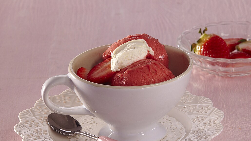 - Zmrazené jahody vsypeme do mixeru, zalijeme smetanou a mixujeme až vznikne hustá smetanová zmrzlina. Můžeme ihned podávat nebo vrátíme do krabičky a uložíme v mrazáku.