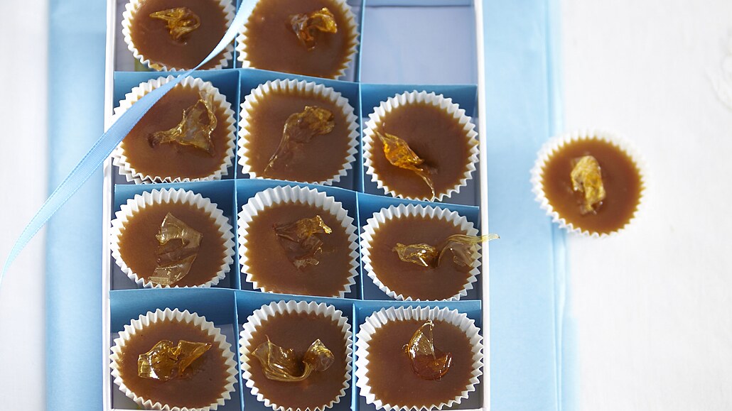 - Kastrůlek vrátíme na sporák a za stálého míchání necháme směs znovu zahřát na 120 °C. Pak ji odstavíme a opatrně rozlijeme do připravených košíčků (použijeme-li papírové, je třeba nechat v sobě minimálně tři). Doprostřed dáme kousek karamelu.