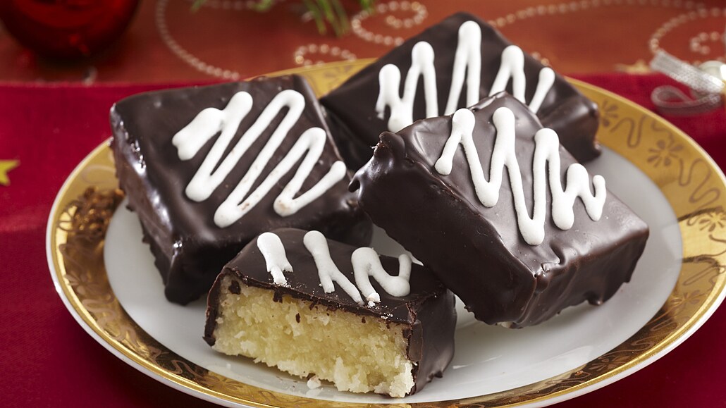 - Ztuhlou hmotu vyjmeme z formy a nakrájíme ostrým, navlhčeným nožem na čtverečky. Namočíme je v rozpuštěné tmavé polevě a necháme zaschnout. Svrchu je pak ozdobíme rozpuštěnou bílou polevou. Po zaschnutí uložíme čtverečky do lednice.