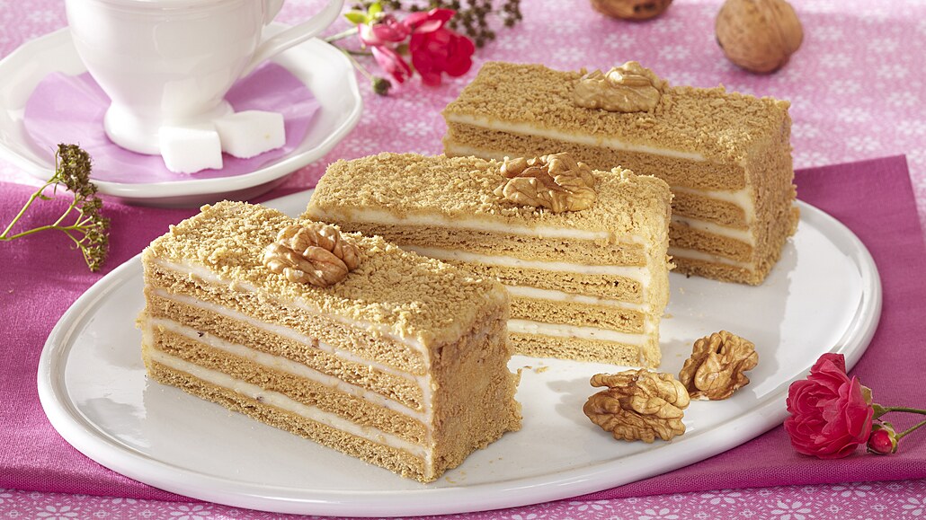 - Změklé máslo vyšleháme s kondenzovaným mlékem na hladký krém, který pak dochutíme mletými ořechy. Korpusy pokapeme rumem a slepíme k sobě částí krému. Povrch i strany potřeme zbylým krémem a obalíme drobečky. Moučník uložíme do chladničky a necháme minimálně 24 hodin odležet. Poté ho nakrájíme na řezy a ozdobíme ořechy.