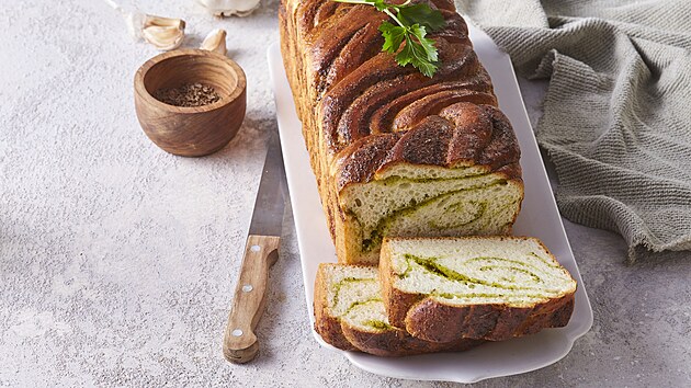 - Těsto rozválíme na obdélník (25 x 40 cm) a potřeme česnekovou náplní, srolujeme, spoj seštípneme a rolku obrátíme spojem dolů. Podélně rozřízneme, konec necháme spojený a prameny spleteme do spirály.