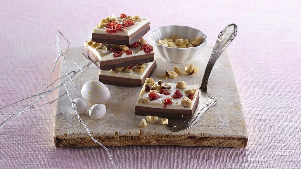 - Nakonec rozpustíme bílou čokoládu a nalijeme ji navrch do pekáčku. Jednu polovinu ihned posypeme lentilkami a druhou oříšky a kandovaným ovocem. Necháme zatuhnout. Čokoládu vyjmeme z pekáčku a nakrájíme na větší kousky.