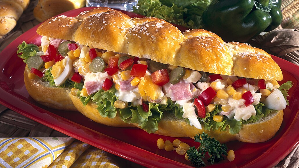 - Majolku a bílý jogurt dáme do mísy a rozšleháme. Přidáme na kolečka nákrájené kyselé okurky, na kostičky nakrájené jablko, šunku a papriku nakrájenou na nudličky. Do směsi přidáme odkapanou nakládanou kukuřici a zlehka vmícháme kousky vejce. Housky rozkrojíme, na spodní část vložíme oprané a osušené listy salátu, na který navršíme vajíčkový salát a přeložíme vrchní část housky.