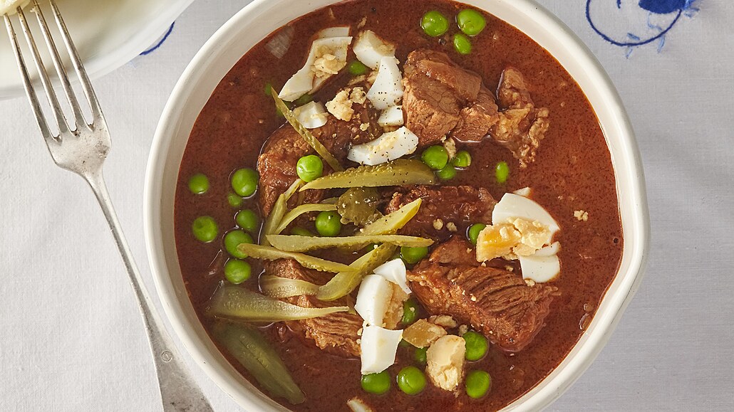 Česká regionální kuchyně nabízí spoustu variací pro úpravu vepřového masa, tahle domažlická s vejci, okurkou a hráškem patří k těm nejchutnějším.