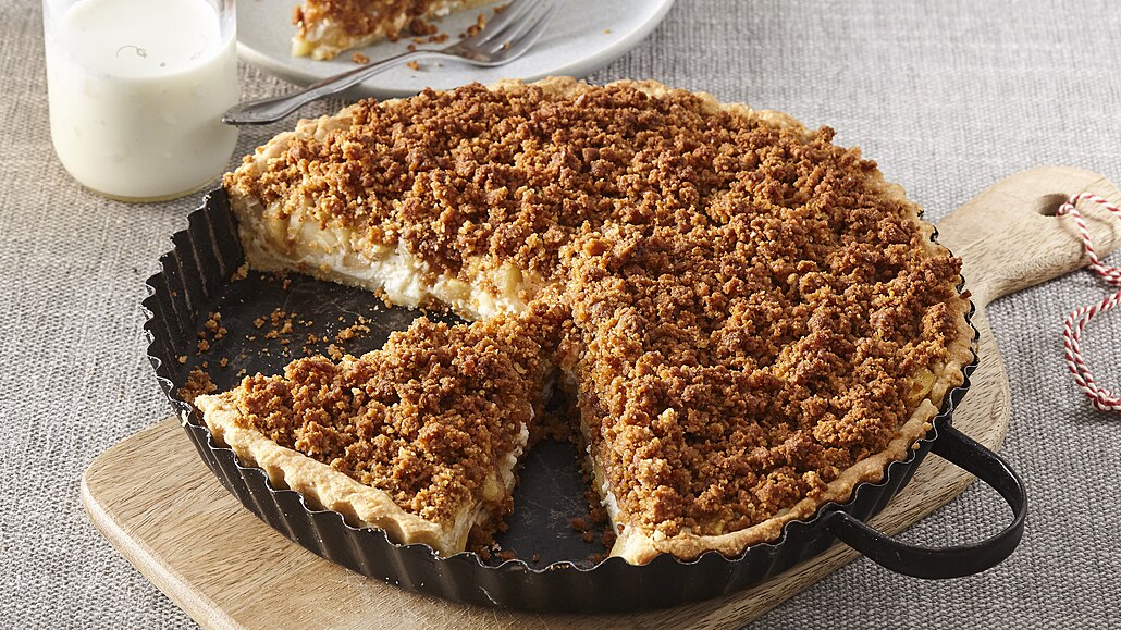 - Na korpus ve formě nalijeme tvarohovou náplň, poklademe ji dušenými jablky a posypeme zbylou drobenkou. Pečeme ve vyhřáté troubě při 165 °C asi 30 minut.