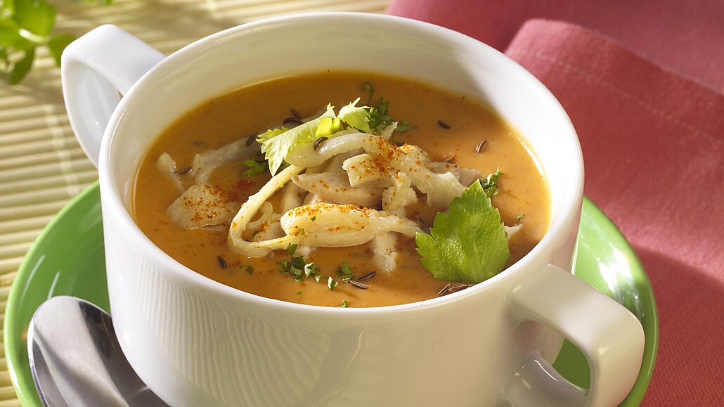 - Česnek oloupeme a prolisujeme do hrnce. Do polévky vložíme masox, ochutíme ji, kmínem, majoránkou a necháme krátce povařit. Podle potřeby přisolíme, ozdobíme lístky řapíkatého celeru a podáváme.