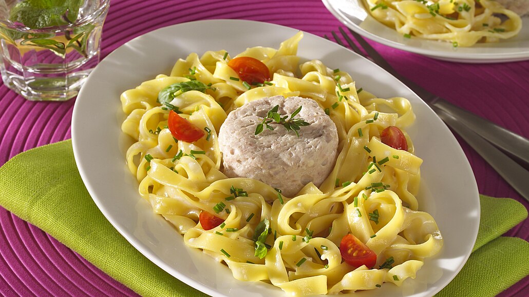 - Nudle rozdělíme na talíře, vyklopíme na ně drůbeží pěnu, přelijeme omáčkou a posypeme nasekanými bylinkami.