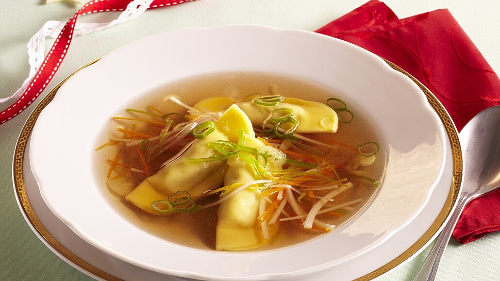 - Kuřecí vývar scedíme. Zbylou mrkev, celer a pórek očistíme a nakrájíme na nudličky. V hrnci rozehřejeme máslo a zeleninu orestujeme. Zalijeme ji scezeným vývarem a krátce povaříme. Při servírování do polévky vložíme taštičky a nakrájenou jarní cibulku.