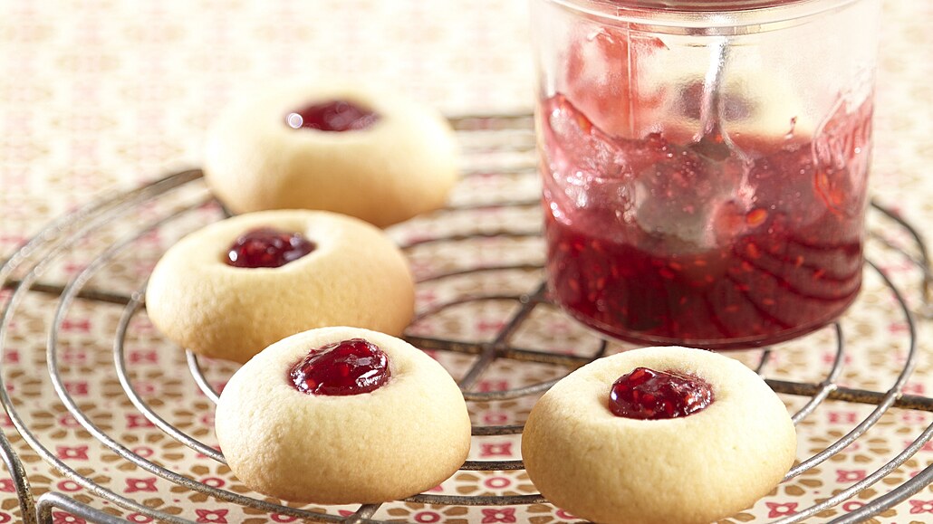 - Pečeme v troubě předehřáté na 180 °C asi 10 minut. Po upečení přendáme na kovovou mřížku a do teplých dukátků do středu doplníme ještě trochu džemu. Cukroví necháme vychladnout.