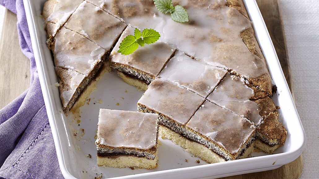 - Mezitím z citronové šťávy a moučkového cukru utřeme hladkou polevu. Rozetřeme ji na povrch dezertu a necháme zaschnout. Řez rozkrájíme na porce a dozdobíme omytými lístky máty.