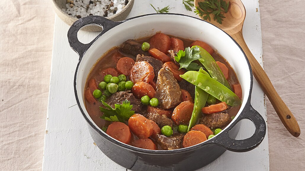 - Z másla a mouky připravíme světlou jíšku. Když maso začne měknout, přidáme jíšku, dochutíme muškátem a dusíme ještě 20 minut. Nakonec přimícháme hrášek. Můžeme podávat např. s vařeným bramborem.