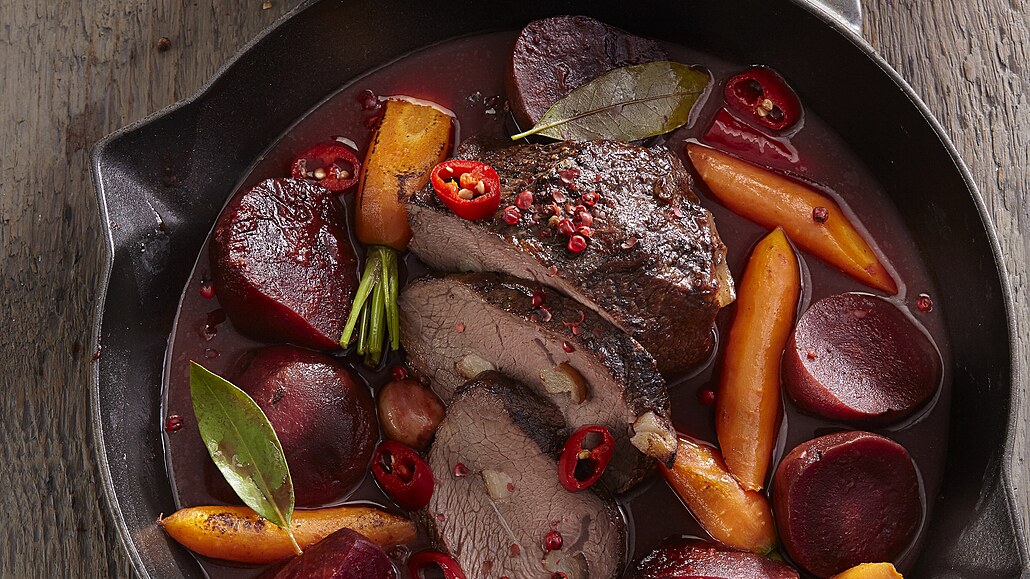 - Nakonec do hrnce vrátíme maso, přidáme bobkové listy, přiklopíme poklicí a dusíme na mírném stupni cca 2 hodiny. Měkké maso nakrájíme na plátky a podáváme například s pečivem.