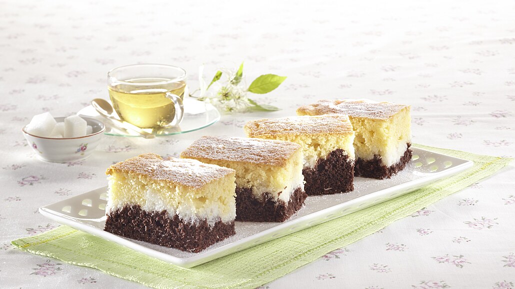 - Těsto rozdělíme na dva díly. Do jedné části vmícháme kakao. Pekáček (30x25 cm) vymažeme tukem a vysypeme hrubou moukou. Nejdříve dáme do pekáčku kakaové těsto, na něj opatrně naneseme kokosovou náplň a na povrch rozetřeme světlé těsto.