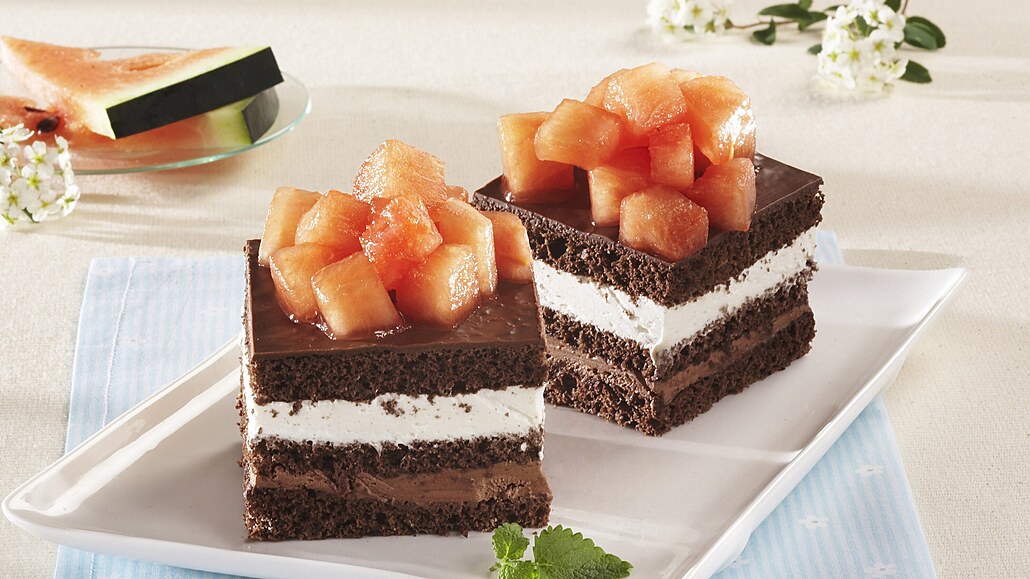 - Nejdříve vyšleháme kakaovou šlehačku a rozetřeme ji na jeden korpus. Na ni položíme druhý díl korpusu. Smetanu vyšleháme s vanilkovým cukrem a rozetřeme ji na povrch druhého dílu korpusu. Položíme poslední díl, lehce přitiskneme a povrch potřeme rozehřátou čokoládovou polevou. Necháme ztuhnout v chladničce. Po ztuhnutí nakrájíme na čtverce 6x6 cm. Povrch ozdobíme červeným melounem nakrájeným na malé kostky.