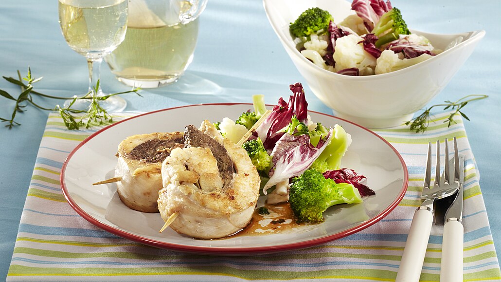 - Zeleninu přendáme do mísy vytřené prolisovaným česnekem. Zakapeme ji citronovou šťávou a olivovým olejem a lehce osolíme. Nakonec přimícháme očištěný, pokrájený salát. Vše promícháme. Masové šneky i salát rozdělíme na talíře, podlijeme výpekem a podáváme.