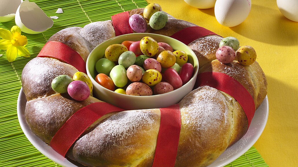 - Pečeme ve vyhřáté troubě nejdříve asi 15 minut při 180°C a pak teplotu snížíme na 160°C a dopékáme dalších 30 minut. Po upečení necháme vychladnout a ozdobíme bonbony ve tvaru vajíček.