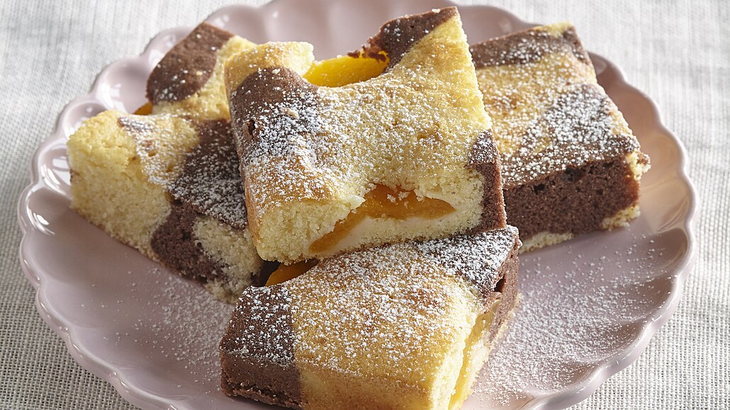 - Navrch pak rozložíme meruňky řeznou stranou dolů. Pečeme v troubě vyhřáté na 180 °C asi 25 minut. Upečený moučník necháme vychladnout a pak ho nakrájíme na kostky. Před podáváním můžeme lehce pocukrovat.