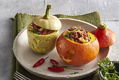 - Mezitím seřízneme a vydlabeme malé dýně. Můžeme je ozdobit vyřezáním obličejů. Podušenou masovou směsí dýně naplníme, vložíme do trouby a pečeme při 180 °C asi 30 minut.