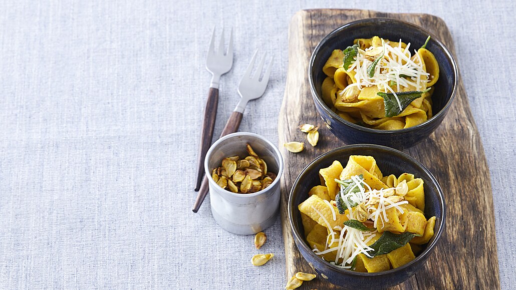 - Z mouky, špetky soli, 3 lžic oleje, vejce a rozmixované dýně vypracujeme hladké pevné těsto. Rozpůlíme ho a každý díl rozválíme na pomoučněném vále na plát silný asi 1mm. Ostrým nožem je nakrájíme na širší nudle dlouhé asi 8 cm. Postupně je prosýpáme trochou hrubé mouky, aby se k sobě nelepily.