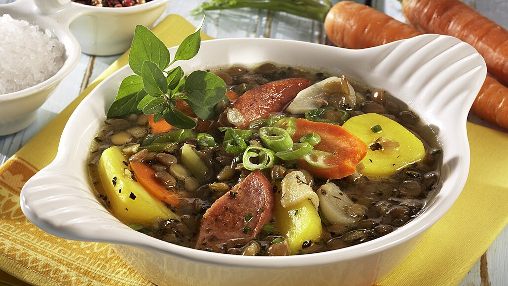- Oloupané brambory pokrájíme na kostičky, očištěnou mrkev s cibulkami a klobásu na kolečka. Brambory a mrkev s klobáskou přidáme do hrnce k čočce. Vaříme dalších 20 minut. Nakonec vmícháme cibulku. Eintopf dochutíme solí, pepřem a majoránkou.