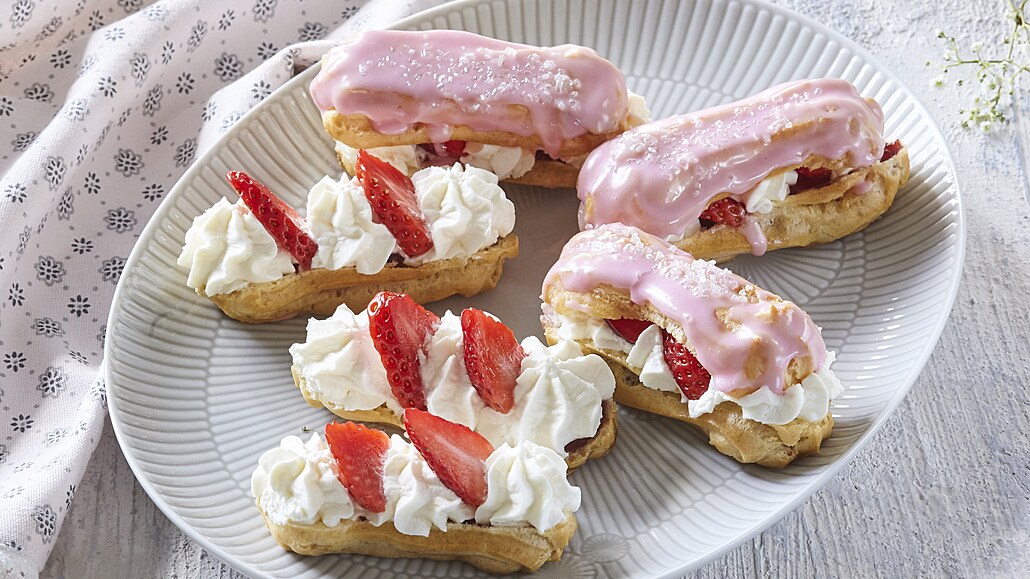 - Do těsta pak postupně zapracujeme jedno vejce po druhém. Naplníme jím cukrářský sáček s řezanou trubičkou a na plech s pečicím papírem nastříkáme cca 10 cm dlouhé pruhy těsta. Potřeme je rozšlehaným vejcem a pečeme v troubě vyhřáté na 200 °C asi 5 minut. Pak teplotu snížíme na 180 °C a dopékáme ještě cca 20 minut, dokud těsto nezezlátne.
