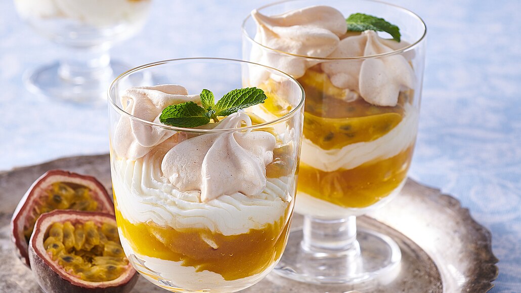 - Do každého poháru nastříkáme pomocí cukrářského sáčku s řezanou trubičkou šlehačku, přidáme pusinky, 2 lžíce mangového pyré a postup zopakujeme. Nakonec přidáme mučenku a zbylé pusinky, dozdobíme mátou a necháme vychladit v chladničce.