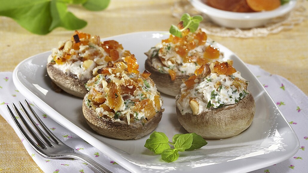 - Žampiony očistíme, nožičky opatrně odlomíme nebo odřízneme a nakrájíme nadrobno. Vlašské ořechy opražíme nasucho na pánvi, necháme vychladnout a nasekáme na malé kousky. Očištěnou cibulku nakrájíme najemno, sušené meruňky na kostičky. Vše promícháme s nasekanými nožičkami žampionů.