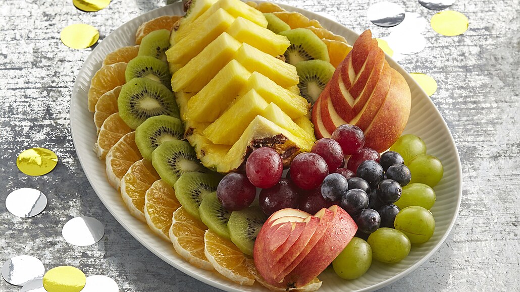 - Do středu talíře položíme ananas, po okraji rozložíme plátky mandarinek, od nich ke středu plátky kiwi, doplníme jablky a hroznovým vínem. Podáváme s připraveným dresinkem.