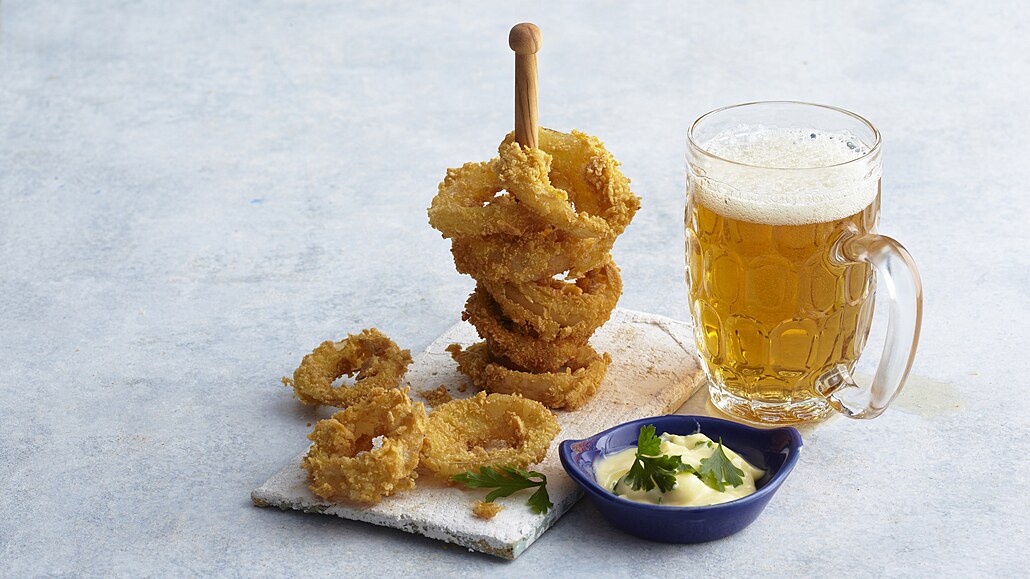 - Obalené kroužky smažíme v rozpáleném oleji z obou stran dozlatova. Vyjmeme je z oleje a položíme na papírový ubrousek, aby se odsál přebytečný tuk. Podáváme např. s majonézovým dipem nebo kečupem.