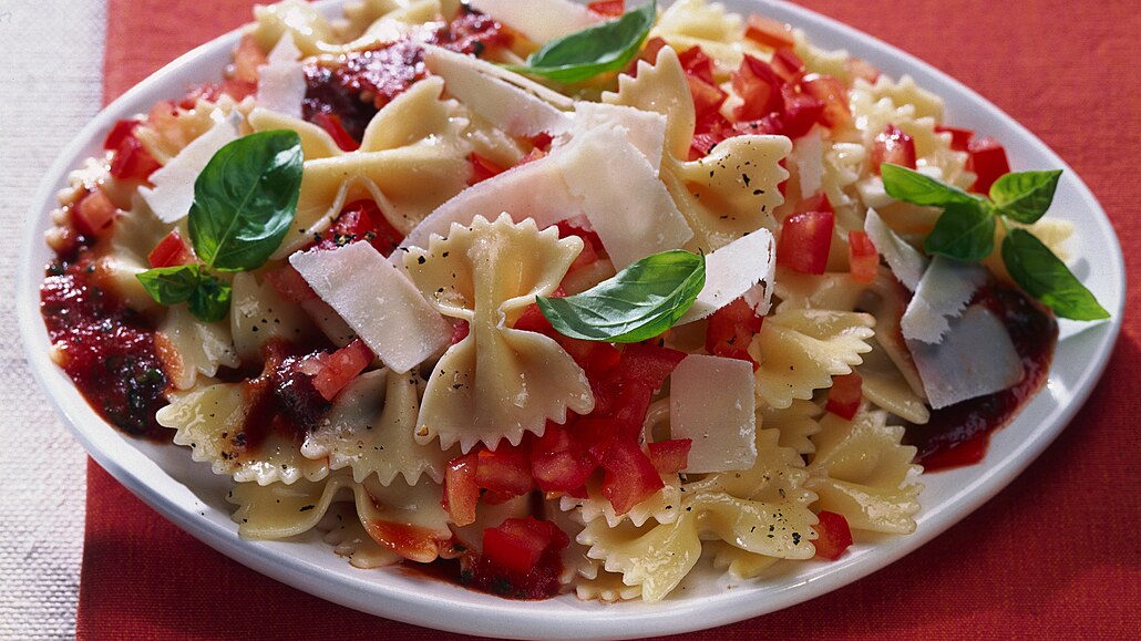 - Farfalle si uvaříme v osolené vodě se zbytkem olivového oleje. Měli bychom je uvařit al dente (na skus). Necháme je řádně okapat. Uvařené scedíme a dáme je do rajské omáčky, zlehka promícháme a rovnou podáváme. Zdobíme zbytky bazalky, hrubě mletým pepřem a sypeme hoblinami parmezánu.