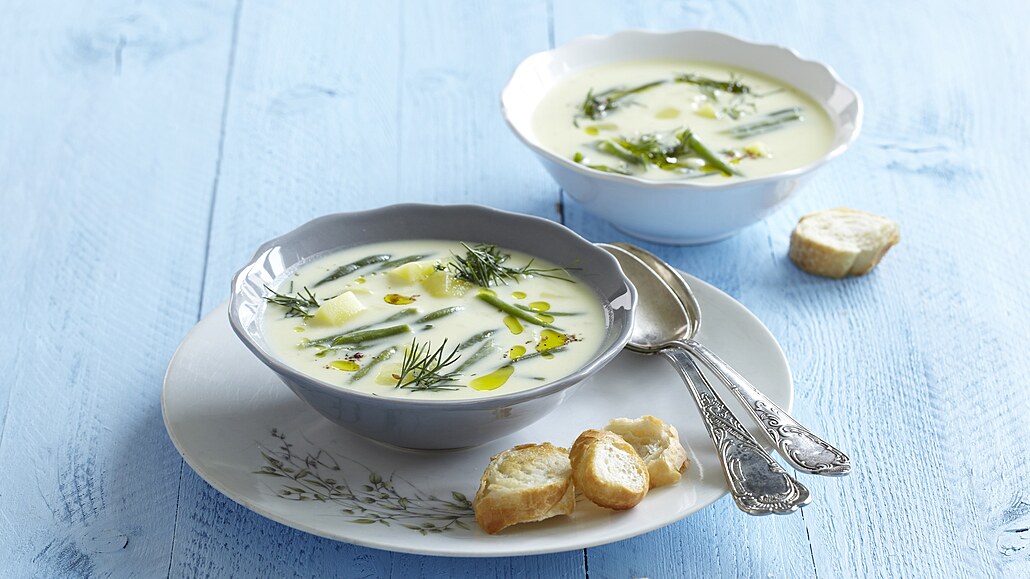 - Polovinu brambor a lusků vyjmeme a polévku rozmixujeme dohladka. Pak do ní ingredience, které jsme dali stranou, vrátíme. Do polévky přilijeme mléko, přidáme kopr, sůl a pepř. Povaříme ještě 5 minut.