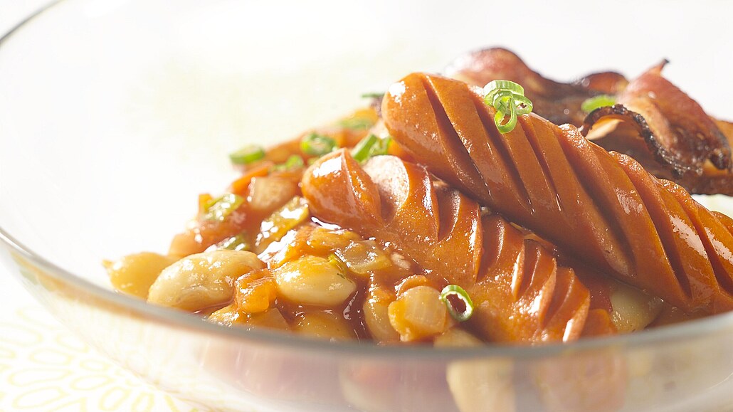 - Párečky nařízneme do mřížky a společně se slaninou opečeme na zbytku oleje. Podáváme s fazolemi. Pokrm posypeme kroužky jarní cibulky.