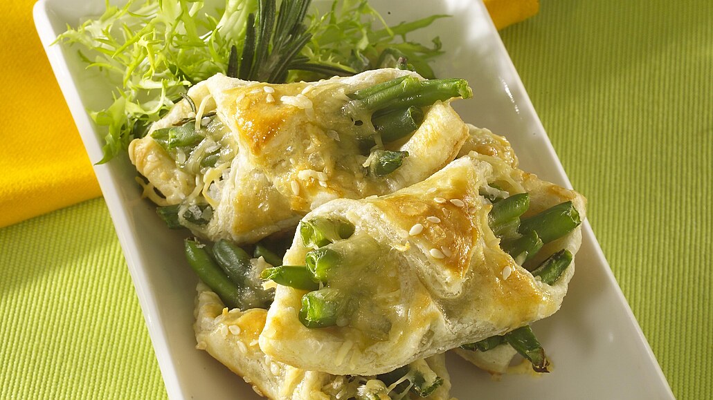 - Těsto rozválíme na vále posypaném hladkou moukou na plát silný asi 3 mm a rozkrájíme ho na čtverce o velikosti 4x4 cm. Na každý čtvereček položíme několik fazolek, kousíček rozmarýnu, osolíme, opepříme a posypeme strouhaným sýrem.