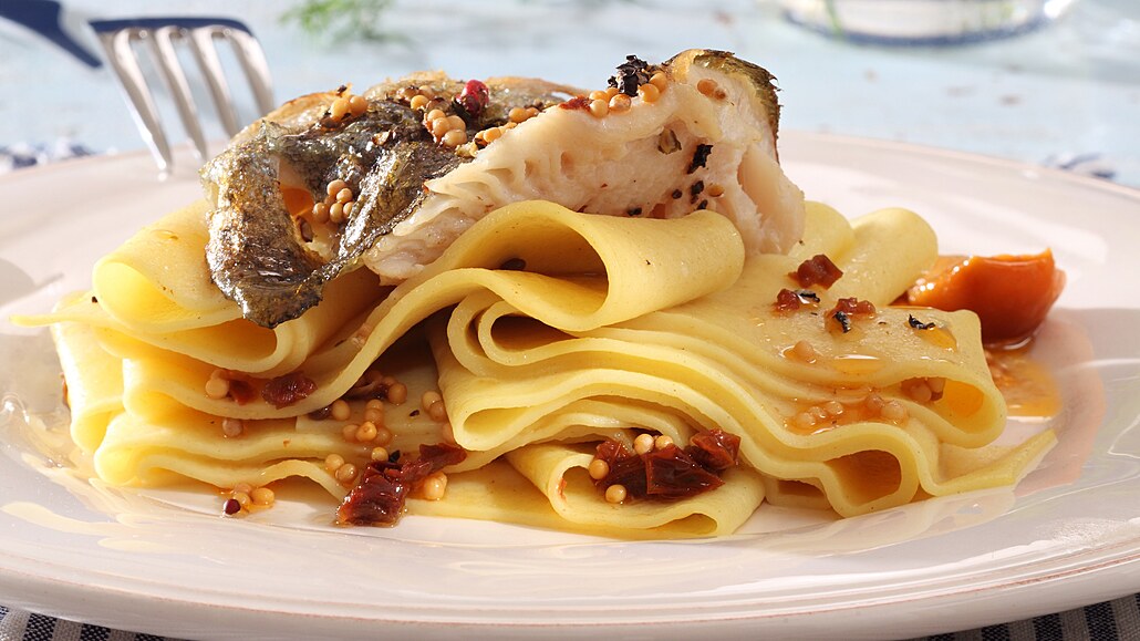 - Široké nudle uvaříme al dente, rozdělíme na talíře, přelijeme rajčatovou směsí s houbami a navrch položíme pstruží filet.