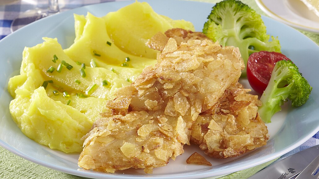 - Filety očistíme a velmi lehce osolíme. Vejce rozklepneme do misky a rozšleháme ho se lžící vody. Bramborové chipsy dáme do mikrotenového sáčku, lehce je rozdrtíme a nasypeme do mísy. Filety obalíme nejprve ve vajíčku a pak v chipsech (dobře je na rybu přitiskneme).
