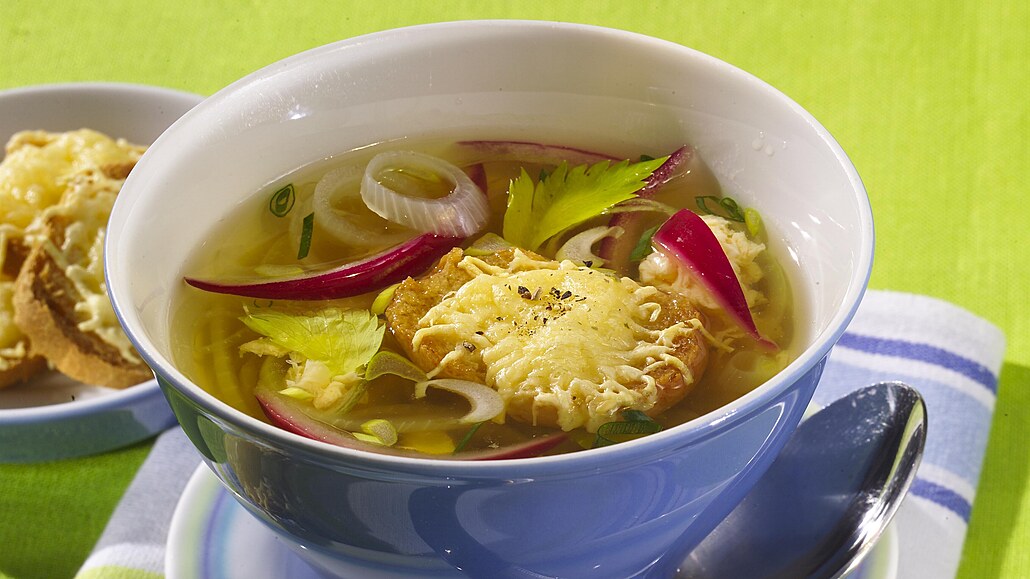 - Polévku rozdělíme do talířů nebo misek a servírujeme se sýrovými krutónky.