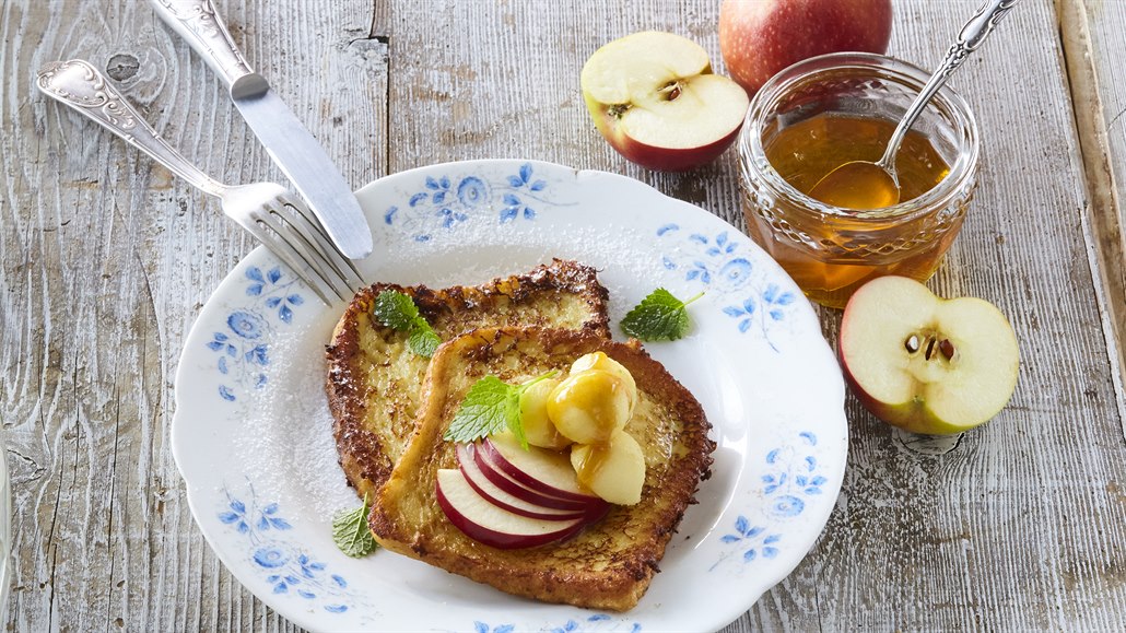 - Jablka oloupeme a pomocí kulatého vykrajovátka vypíchneme kuličky. Pokapeme je šťávou z citronu. Hotové tousty podáváme s jablečnými kuličkami zakápnutými lehce nahřátým medem. Můžeme dozdobit meduňkou a plátky jablek.