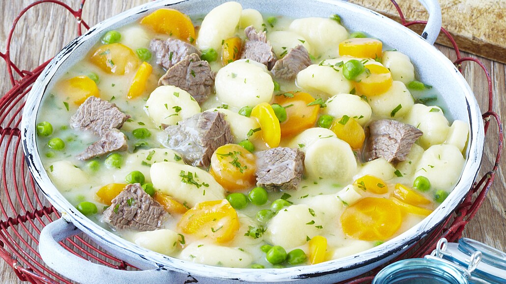 - Do bešamelu vložíme gnocchi, pokrájenou zeleninu s masem a hrášek s petrželkou. Vše společně prohřejeme a dochutíme solí a muškátovým květem.