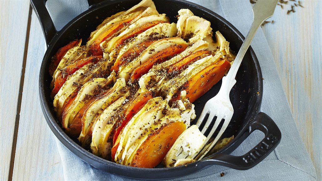 - Mrkev, petržel a celer nakrájíme na stejně velká kolečka o tloušťce asi 1,5 cm. Tofu nakrájíme na slabé plátky. Římský kmín smícháme s cukrem a s rozpuštěným máslem a promícháme zeleninu s touto směsí.