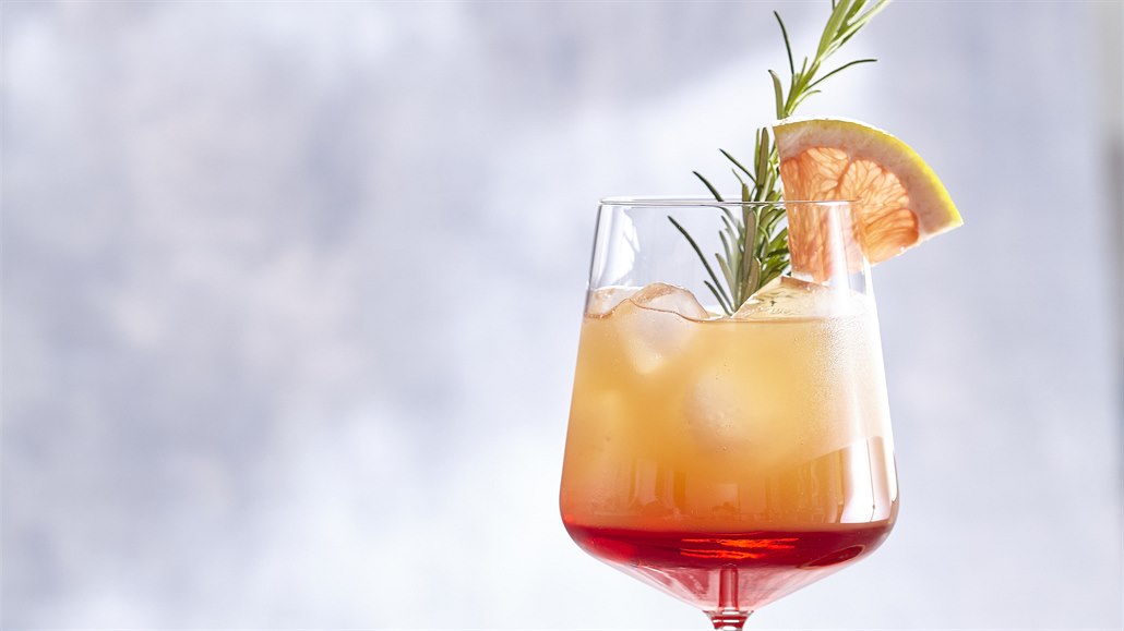 - Na dno vychlazené servírovací sklenice nalijeme 2 lžíce višňového sirupu, přidáme ledové kostky a pomalu zalijeme namíchaným drinkem. Sklenici dozdobíme kouskem čerstvého grepu, větvičkou rozmarýnu a ihned podáváme.