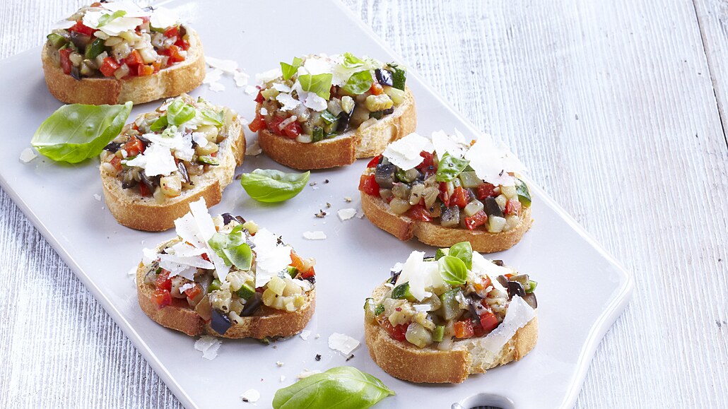 - Bagetu nakrájíme na plátky a v troubě ogrilujeme. Připravené bagetky potřeme vrstvou zeleninové kaponáty a ozdobíme strouhaným parmazánem a bylinkami.