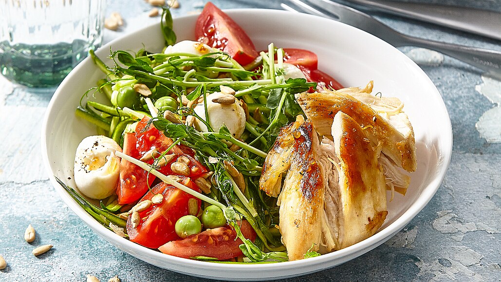 - Cuketu smícháme s pestem a okurkou a rozdělíme je do misek. Přidáme rajčata, hrášek, hráškové klíčky, rajčátka a maso. Posypeme semínky, mozzarellou a podáváme.