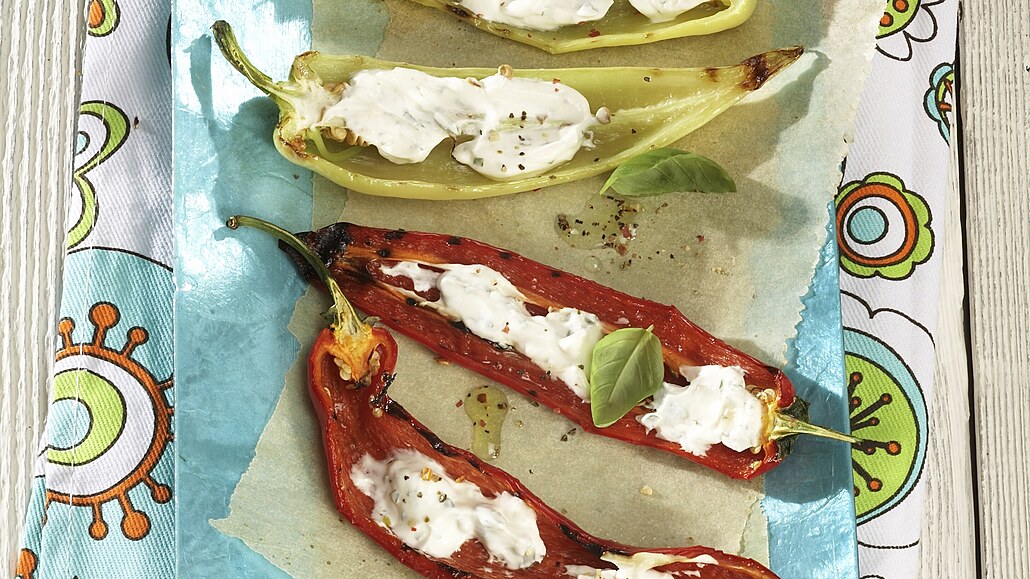 - Papriky očistíme, podélně rozpůlíme a odstraníme semínka. Paprikové lodičky opečeme po obou stranách na grilovací pánvi bez tuku. Lžičkou do nich rozdělíme sýrový krém, ozdobíme lístečky bazalky a podáváme.